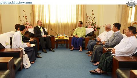 ပြည်ထောင်စုလွှတ်တော်၊ ဥပဒေရေးရာနှင့်အထူးကိစ္စရပ်များ လေ့လာဆန်းစစ်သုံးသပ်ရေး ကော်မရှင်ဥက္ကဋ္ဌ သူရဦးရွှေမန်းသည် နိုင်ငံတကာငွေကြေးရန်ပုံငွေအဖွဲ့ (International Monetary Fund – IMF) မှ Policy and Legal Advisor ဖြစ်သူ Mr. Michael Oomen ဦးဆောင်သည့် ကိုယ်စားလှယ်အဖွဲ့အား ယနေ့နေ့လယ် ၂ နာရီ အချိန်တွင် နေပြည်တော်ရှိ လွှတ်တော်ရေးရာ ဆောင်အမှတ် (I-1) ၌ လက်ခံတွေ့ဆုံသည်။