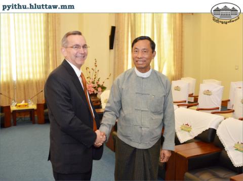 ပြည်ထောင်စုလွှတ်တော်၊ ဥပဒေရေးရာနှင့်အထူးကိစ္စရပ်များ လေ့လာဆန်းစစ်သုံးသပ်ရေးကော်မရှင် ဥက္ကဋ္ဌ သူရဦးရွှေမန်း သည် ပြည်ထောင်စုသမ္မတ မြန်မာနိုင်ငံဆိုင်ရာ အမေရိကန် သံအမတ်ကြီး H.E. Mr Scot Marciel အား ယနေ့ မွန်းလွဲ ၃ နာရီခွဲအချိန်တွင် နေပြည်တော်ရှိ လွှတ်တော်ရေးရာဆောင်အမှတ် (I-1) ၌ လက်ခံတွေ့ဆုံသည်။