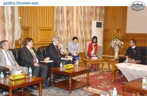 ပြည်သူ့လွှတ်တော်ဥက္ကဋ္ဌ ဦးဝင်းမြင့်သည် ပြည်ထောင်စုသမ္မတမြန်မာနိုင်ငံတောဆိုင်ရာ သံအမတ်ကြီးများဖြစ်ကြသော ဗြိတိန်နိုင်ငံ သံအမတ်ကြီး H.E. Mr. Andrew Patrick ၊ ဒိန်းမတ်နိုင်ငံ သံအမတ်ကြီး H.E. Mr. Peter Lysholt Hansen ၊ အမေရိကန်ပြည်ထောင်စု သံအမတ်ကြီး H.E. Mr. Scot Marciel နှင့် ဥရောပသမဂ္ဂကိုယ်စားလှယ်အဖွဲ့ရုံး ယာယီတာဝန်ခံ Mr. Colin STEINBACH တို့အား ယနေ့ နံနက် ၉ နာရီချိန်တွင် နေပြည်တော်ရှိ လွှတ်တော်အဆောက်အအုံ၊ ပြည်သူ့လွှတ်တော် ဧည့်ခန်းမဆောင်၌ လက်ခံတွေ့ဆုံသည်။