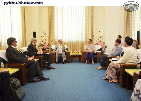 ပြည်ထောင်စုလွှတ်တော်၊ ဥပဒေရေးရာနှင့် အထူးကိစ္စရပ်များ လေ့လာဆန်းစစ် သုံးသပ်ရေး ကော်မရှင်ဥက္ကဋ္ဌ သူရဦးရွှေမန်းသည် ပြည်ထောင်စုသမ္မတ မြန်မာနိုင်ငံဆိုင်ရာ သံအမတ်ကြီးများ ဖြစ်ကြသော အမေရိကန်နိုင်ငံသံအမတ်ကြီး H.E. Mr. Scot Marciel၊ ဗြိတိန်နိုင်ငံသံအမတ်ကြီး H.E. Mr. Andrew Patrick ၊ ဒိန်းမတ်နိုင်ငံသံအမတ်ကြီး H.E. Mr. Peter Lysholt Hansen နှင့် ဥရောပသမဂ္ဂသံရုံးမှ သံရုံးတာဝန်ခံ Dr. Colin Steinbach တို့ပါဝင်သည့် ကိုယ်စားလှယ်အဖွဲ့အား ယနေ့နံနက် ၈ နာရီခွဲတွင် နေပြည်တော်ရှိ လွှတ်တော်အဆောက်အဦ ရေးရာဆောင်အမှတ် (I-1) ဧည့်ခန်းမ၌ လက်ခံ တွေ့ဆုံသည်။
