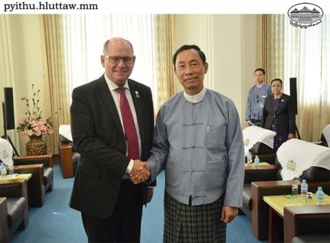 ပြည်ထောင်စုလွှတ်တော်၊ ဥပဒေရေးရာနှင့်အထူးကိစ္စရပ်များ လေ့လာဆန်းစစ်သုံးသပ်ရေး ကော်မရှင် ဥက္ကဋ္ဌ သူရဦးရွှေမန်း သည် ဆွီဒင်နိုင်ငံ လွှတ်တော်ဥက္ကဋ္ဌ ဖြစ်သည့် The Right Honorable Mr Urban Ahlin အား မွန်းလွဲ ၁ နာရီ ၁၅ မိနစ်တွင် နေပြည်တော်ရှိ လွှတ်တော်အဆောက်အအုံ ရေးရာဆောင် အမှတ် (I-1) ဧည့်ခန်းမဆောင်၌ လက်ခံတွေ့ဆုံခဲ့သည်။