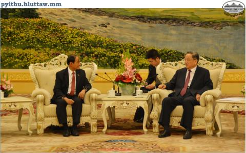 တရုတ်ပြည်သူ့သမ္မတနိုင်ငံ၊ အမျိုးသားပြည်သူ့ကွန်ဂရက် အမြဲတမ်းကော်မတီဥက္ကဋ္ဌ H.E. Mr. Zhang Dejiang ၏ ဖိတ်ကြားချက်အရ တရုတ်ပြည်သူ့သမ္မတနိုင်ငံ၊ ပေကျင်းမြို့သို့ ချစ်ကြည်ရေးခရီး ရောက်ရှိနေသော ပြည်သူ့လွှတ်တော် ဥက္ကဋ္ဌ ဦးဝင်းမြင့် သည် လွှတ်တော်ရေးရာကော်မတီ အဖွဲ့ဝင်များ လိုက်ပါလျက် စက်တင်ဘာလ ၈ ရက်နေ့ ညနေ ၃ နာရီချိန်တွင် တရုတ်ပြည်သူ့သမ္မတနိုင်ငံ၊ ပြည်သူ့ခန်းမဆောင်ကြီး၊ အစည်းအဝေးခန်းမ၌ တရုတ်ပြည်သူ့နိုင်ငံရေး အတိုင်ပင်ခံ ကွန်ဖရင့် အမျိုးသားကော်မတီ ဥက္ကဋ္ဌ H.E. Mr. Yu Zheng Sheng နှင့် တွေ့ဆုံဆွေးနွေးသည်။