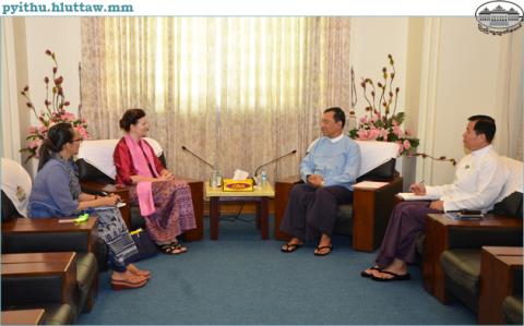 ပြည်ထောင်စုလွှတ်တော်၊ ဥပဒေရေးရာနှင့်အထူးကိစ္စရပ်များ လေ့လာဆန်းစစ်သုံးသပ်ရေး ကော်မရှင်ဥက္ကဋ္ဌ သူရဦးရွှေမန်း သည် ပြည်ထောင်စုသမ္မတ မြန်မာနိုင်ငံရှိ ကမ္ဘာ့ကုလသမဂ္ဂဌာနေ ညှိနှိုင်းရေးမှူး Ms. Renata Lok-Dessallien အား ယနေ့ နံနက် ၉ နာရီခွဲ အချိန်တွင် နေပြည်တော်ရှိ လွှတ်တော် ရေးရာဆောင်အမှတ် (I-1) ၌ လက်ခံတွေ့ဆုံသည်။
