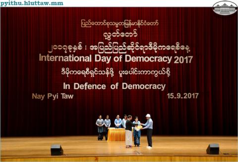 ၂၀၁၇ ခုနှစ် အပြည်ပြည်ဆိုင်ရာ ဒီမိုကရေစီနေ့ (International Day of Democracy 2017) အခမ်းအနားကို ယနေ့ မွန်းတည့် ၁၂ နာရီခွဲတွင် နေပြည်တော်ရှိ လွှတ်တော် အဆောက်အအုံ သဘင်ဆောင်၌ ကျင်းပသည်။