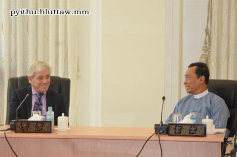 ပြည်ထောင်စုလွှတ်တော် ဥပဒေရေးရာနှင့်အထူးကိစ္စရပ်များ လေ့လာဆန်း စစ်သုံးသပ်ရေး ကော်မရှင် ဥက္ကဋ္ဌ သူရဦးရွှေမန်း သည် ဗြိတိန်နိုင်ငံ အောက်လွှတ်တော် ဥက္ကဋ္ဌ Mr. John Bercow ဦးဆောင်သည့် ကိုယ်စား လှယ်အဖွဲ့အား ယနေ့ မွန်းလွဲ ၃ နာရီတွင် နေပြည်တော်ရှိ လွှတ်တော် အဆောက်အအုံ ရေးရာဆောင် အမှတ် (I-11) ၌ လက်ခံတွေ့ဆုံသည်။