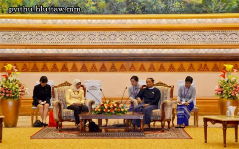 ပြည်သူ့လွှတ်တော် ဥက္ကဋ္ဌ ဦးဝင်းမြင့် သည် စင်ကာပူပါလီမန် ဥက္ကဋ္ဌ H.E. Mdm. Halimah Yacob နှင့် အဖွဲ့အား ယနေ့ နံနက် ၁၁ နာရီ ၁၅ မိနစ်တွင် နေပြည်တော်ရှိ လွှတ်တော်အဆောက်အအုံ၊ ဇမ္ဗူသီရိ ဧည့်ခန်းမဆောင်၌ တွေ့ဆုံသည်။