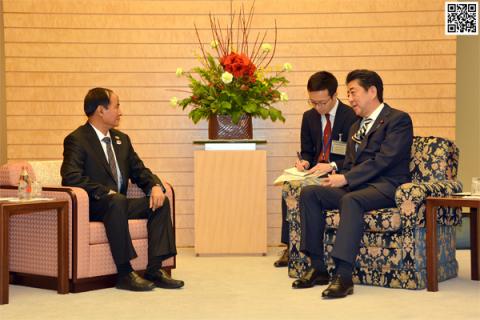 ဂျပန်နိုင်ငံ၊ အောက်လွှတ်တော်ဥက္ကဋ္ဌ H.E. Mr. Tadamori Oshima ၏ ဖိတ်ကြားချက်အရ ဂျပန်နိုင်ငံသို့ ချစ်ကြည်ရေးခရီးရောက်ရှိနေသော ပြည်သူ့လွှတ်တော် ဥက္ကဋ္ဌ ဦးဝင်းမြင့်သည် ဒီဇင်ဘာလ ၁ ရက်နေ့ မွန်းလွဲ ၃ နာရီ ၁၀ မိနစ်ချိန်တွင် ဂျပန်အစိုးရအိမ်တော်၊ အထူးဧည့်သည်တော်များ ခန်းမဆောင်၌ ဂျပန်နိုင်ငံ၊ ဝန်ကြီးချုပ် H.E. Mr. Shinzo Abe နှင့် တွေ့ဆုံဆွေးနွေးသည်။