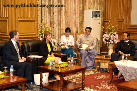 ပြည်သူ့လွှတ်တော်ဥက္ကဋ္ဌ ဦးဝင်းမြင့်သည် လွှတ်တော် အရည်အသွေးမြှင့်တင်ရေး အတွက် ကူညီ ဆောင်ရွက်ပေးနေသော Capacity Building Project ခေါင်းဆောင်ဖြစ်သည့် အီတလီ အမျိုးသားစီမံခန့်ခွဲမှု ကျောင်းမှ MENA-OECD Governance Programme Centre ၏ အမှုဆောင် ဒါရိုက်တာ Ms. Renata Pavlov အား ယနေ့ မွန်းလွဲ ၂ နာရီတွင် နေပြည်တော်ရှိ လွှတ်တော် အဆောက်အအုံ၊ ပြည်သူ့လွှတ်တော် ဧည့်ခန်းမ၌ လက်ခံတွေ့ဆုံသည်။
