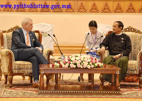 ပြည်သူ့လွှတ်တော်ဥက္ကဋ္ဌ ဦးဝင်းမြင့်သည် စင်္ကာပူနိုင်ငံဆိုင်ရာ အမေရိကန်သံအမတ်ကြီး H.E.Mr. Kirk Wagar ဦးဆောင်သော စင်ကာပူနိုင်ငံဆိုင်ရာ အမေရိကန်ကုန်သည်ကြီးများ အသင်း၏ ကိုယ်စားလှယ်အဖွဲ့အား ယနေ့ နံနက် ၈ နာရီခွဲတွင် နေပြည်တော်ရှိလွှတ်တော် အဆောက်အအုံ ဇမ္ဗူသီရိဧည့်ခန်းမဆောင်၌ လက်ခံတွေ့ဆုံသည်။
