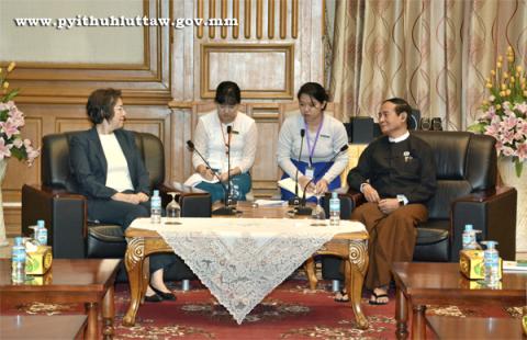 ပြည်သူ့လွှတ်တော် ဥက္ကဋ္ဌ ဦးဝင်းမြင့် သည် ကုလသမဂ္ဂ၏ မြန်မာနိုင်ငံ လူ့အခွင့်အရေးဆိုင်ရာ အထူးအစီရင်ခံစာ တင်သွင်းသူ မစ္စယန်ဟီလီ နှင့်အဖွဲ့အား ၂၀၁၆ ခုနှစ် ဇွန်လ ၂၉ ရက်နေ့ နံနက် ၁၀ နာရီတွင် နေပြည်တော်ရှိ လွှတ်တော်အဆောက်အအုံ ပြည်သူ့လွှတ်တော် ဧည့်ခန်းမ၌ လက်ခံတွေ့ဆုံသည်။