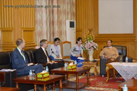 ပြည်သူ့လွှတ်တော် ဥက္ကဋ္ဌ ဦးဝင်းမြင့် သည် ပြည်ထောင်စုသမ္မတ မြန်မာနိုင်ငံတော်ဆိုင်ရာ အမေရိကန် သံအမတ်ကြီး H.E.Mr. Scot Marciel အား ယနေ့ မွန်းလွဲ (၃) နာရီတွင် နေပြည်တော်ရှိ လွှတ်တော် အဆောက်အအုံ ပြည်သူ့လွှတ်တော် ဧည့်ခန်းမ၌ လက်ခံတွေ့ဆုံသည်။
