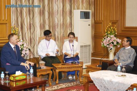 ပြည်သူ့လွှတ်တော်ဥက္ကဋ္ဌ ဦးဝင်းမြင့်သည် ပြည်ထောင်စုသမ္မတ မြန်မာနိုင်ငံတော် ဆိုင်ရာ ရုရှားဖက်ဒရေးရှင်း နိုင်ငံသံအမတ်ကြီး H.E.Dr. Nikolay Listopadov အား ယနေ့ မွန်းလွဲ ၃ နာရီ တွင် နေပြည်တော်ရှိ လွှတ်တော်အဆောက်အအုံ ပြည်သူ့လွှတ်တော် ဧည့်ခန်းမဆောင်၌ လက်ခံ တွေ့ဆုံသည်။