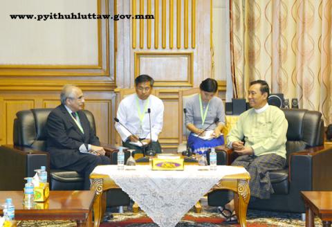 ပြည်သူ့လွှတ်တော် ဥက္ကဋ္ဌ သူရဦးရွှေမန်း သည် ကုလသမဂ္ဂအတွင်းရေးမှူးချုပ်၏ မြန်မာနိုင်ငံဆိုင်ရာ အထူးအကြံပေး ပုဂ္ဂိုလ် မစ္စတာ ဗီဂျေ နမ်ဘီးယား အား ၂၀၁၅ ခုနှစ် အောက်တိုဘာလ ၁၄ ရက်နေ့ နံနက် (၁၀း၀၀) နာရီတွင် နေပြည်တော်ရှိ လွှတ်တော်အဆောက်အအုံ၊ ပြည်သူ့လွှတ်တော်ဧည့်ခန်းမ ၌ လက်ခံတွေ့ဆုံသည်။