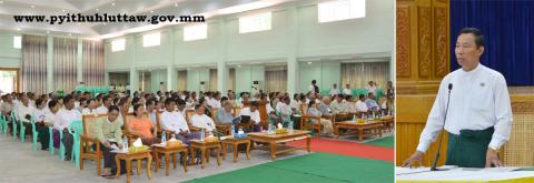 ဖြူးမြို့နယ်ခန်းမသစ်ကို အများပြည်သူ အကျိုးရှိစွာ အသုံးပြုရေးနှင့် မွမ်းမံထိန်းသိမ်းရေး ကိစ္စနှင့် မြို့နယ်ပညာရေး မြှင့်တင်မှု လုပ်ငန်းများအတွက် ဒေသပညာရေး အသင်းအဖွဲ့များနှင့် တွေ့ဆုံညှိနှိုင်း အစည်းအဝေးကို ၂၀၁၅ ခုနှစ် စက်တင်ဘာလ ၂၆ ရက်နေ့ နံနက် (၉း၀၀) နာရီတွင် ပဲခူးတိုင်းဒေသကြီး ဖြူးမြို့ရှိ အဆိုပါခန်းမသစ်၌ ကျင်းပရာ ပြည်သူ့လွှတ်တော် ဥက္ကဋ္ဌ သူရဦးရွှေမန်း တက်ရောက် အမှာစကား ပြောကြားသည်။