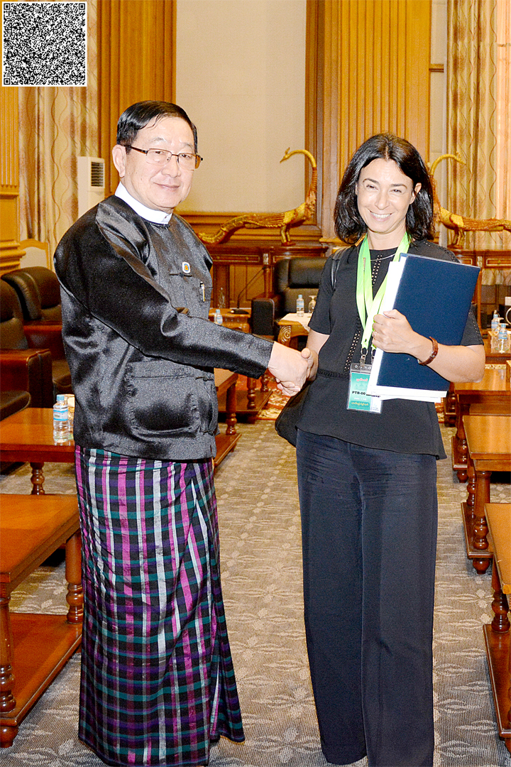 ပြည်သူ့လွှတ်တော်ဥက္ကဋ္ဌ ဦးတီခွန်မြတ် သည် ပြည်ထောင်စုသမ္မတမြန်မာနိုင်ငံတော် ဆိုင်ရာ အီတလီနိုင်ငံ သံအမတ်ကြီး H.E. Mrs. Alessandra SCHIAVO အား ယနေ့ မွန်းလွဲ ၃ နာရီခွဲတွင် နေပြည်တော်ရှိ လွှတ်တော်အဆောက်အအုံ၊ ပြည်သူ့လွှတ်တော်ဆောင် ဧည့်ခန်းမ၌ လက်ခံတွေ့ဆုံသည်။