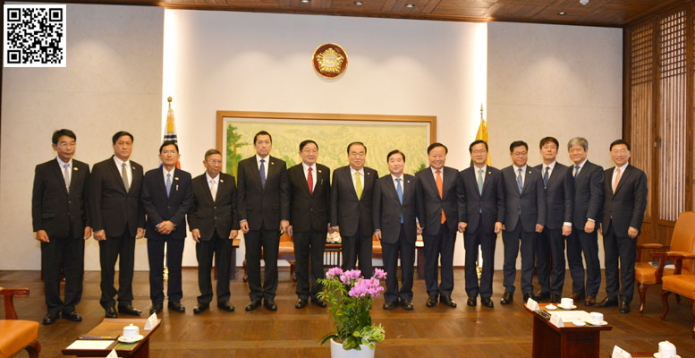 ကိုရီးယား သမ္မတနိုင်ငံ၊ အမျိုးသားလွှတ်တော် ဥက္ကဋ္ဌ H.E. Mr. Moon Hee-sang ၏ ဖိတ်ကြားချက် အရ ကိုရီးယား သမ္မတနိုင်ငံသို့ ချစ်ကြည်ရေးခရီး ရောက်ရှိနေသော ပြည်သူ့လွှတ်တော် ဥက္ကဋ္ဌ ဦးတီခွန်မြတ် ခေါင်းဆောင်သော မြန်မာလွှတ်တော် ချစ်ကြည်ရေး ကိုယ်စားလှယ်အဖွဲ့သည် ယနေ့နံနက် ဒေသစံတော်ချိန် ၁၁၀၀ နာရီချိန်တွင် ကိုရီးယား သမ္မတနိုင်ငံ၊ အမျိုးသားလွှတ်တော်သို့ ရောက်ရှိရာ ကိုရီးယားသမ္မတနိုင်ငံ၊ အမျိုးသားလွှတ်တော် ဥက္ကဋ္ဌ နှင့် ကိုယ်စားလှယ်များက ကြိုဆို ကြသည်။