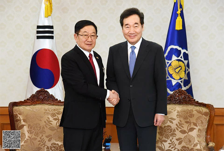 ကိုရီးယားသမ္မတနိုင်ငံ အမျိုးသားလွှတ်တော်ဥက္ကဋ္ဌ H.E. Mr. Moon Hee - sang ၏ ဖိတ်ကြား ချက်အရ ကိုရီးယားသမ္မတနိုင်ငံသို့ ချစ်ကြည်ရေးခရီးရောက်ရှိနေသော ပြည်သူ့လွှတ်တော် ဥက္ကဋ္ဌ ဦးတီခွန်မြတ် ခေါင်းဆောင်သော မြန်မာလွှတ်တော်ချစ်ကြည်ရေးကိုယ်စားလှယ်အဖွဲ့အား ကိုရီးယား သမ္မတနိုင်ငံ ဝန်ကြီးချုပ် H.E. Mr. Lee Nak-yon က အောက်တိုဘာလ ၂ ရက်နေ့ ဒေသစံတော်ချိန် (၁၇၃၀) နာရီအချိန်တွင် ဝန်ကြီးချုပ်၏ ဧည့်ခန်းမ၌ လက်ခံတွေ့ဆုံသည်။