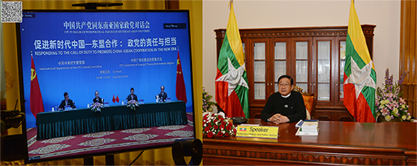 ပြည်သူ့လွှတ်တော်ဥက္ကဋ္ဌ ဦးတီခွန်မြတ်သည် ယနေ့ မွန်းလွဲ ၂ နာရီအချိန်တွင် တရုတ်ကွန်မြူနစ်ပါတီ နှင့် အရှေ့တောင်အာရှနိုင်ငံများမှ နိုင်ငံရေးပါတီ တို့အကြား ဗီဒီယိုကွန်ဖရင့်စနစ်ဖြင့် ပြုလုပ်သည့် ဆွေးနွေးပွဲအခမ်းအနား (CPC in Dialogue with Political Parties of Southeast Asian Countries) သို့ တက်ရောက်မိန့်ခွန်းပြောကြားသည်။